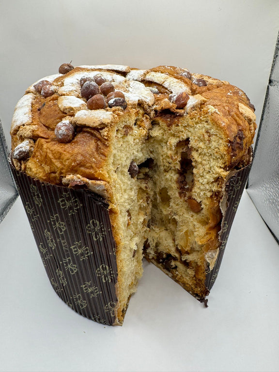 Le panettone chocolat & noisette se compose de farine, d'eau, de beurre, sel, sucre, levain naturel, d'oeuf, de vanille et de chocolat au lait, noisette caraméliser.