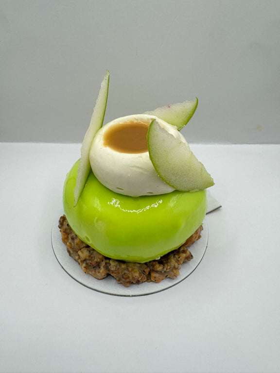 L’Éclat du verger se compose d'un granola noisette, un insert pomme granny, un gel pomme, d'une mousse au cidre et d'un caramel mou.