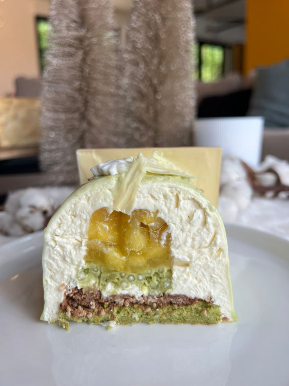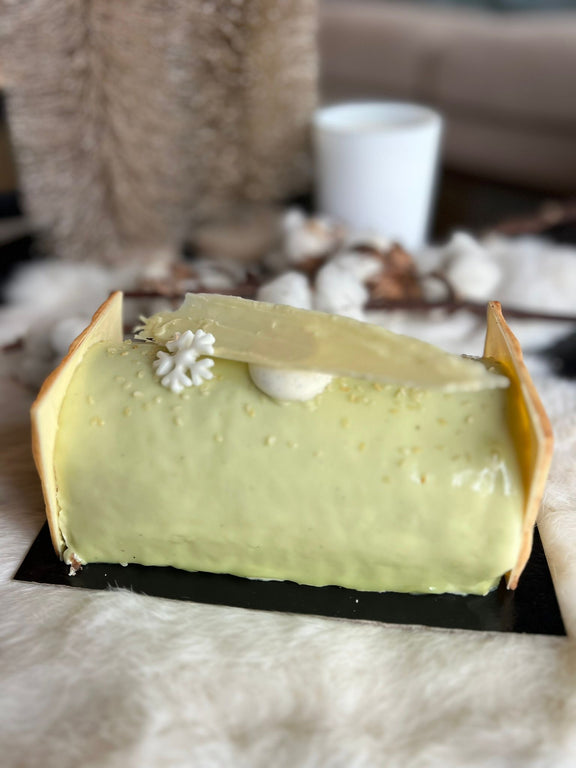 La bûche Eveil d'Asie se compose d'un biscuit matcha, d'un croustillant au sésame, d'un insert perles du Japon, d'un confit d'ananas et d'une ganache montée au citron