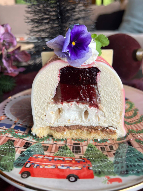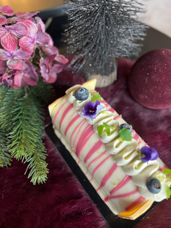 La bûche Tea Time se compose d'un biscuit madeleine, d'un croustillant amande, d'un confit de cassis, d'une crème de marron, de meringue et d'une mousse au thé Earl Grey