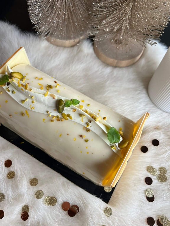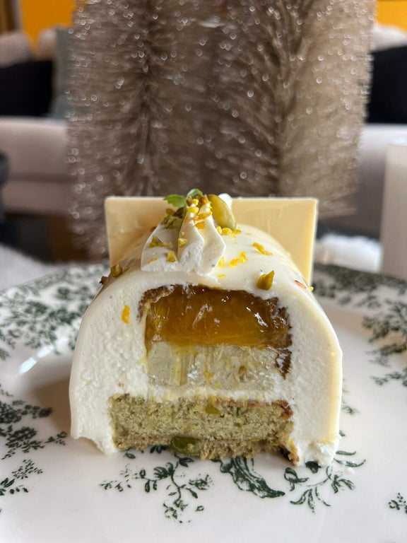 La bûche Douceur d'Orient se compose d'un financier pistache, d'un croustillant pistache, d'un crémeux pistache, de confit d'orange et d'une mousse au fromage blanc et à la fleur d'oranger
