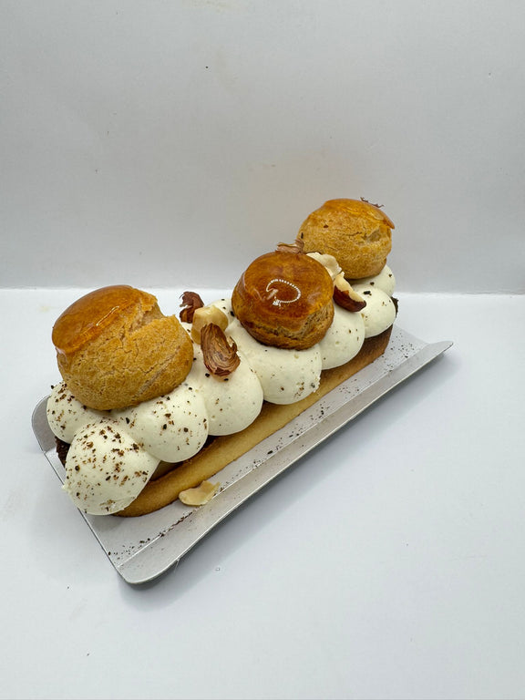 Le Saint-Honoré se compose d'une pâte sucrée, d'une crème pâtissière à la noisette, de praliné, d'une ganache à la vanille et de chou caramélisé.