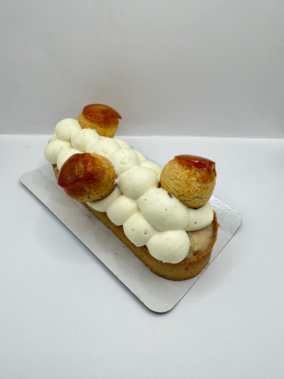 Le Saint-Honoré se compose d'une pâte sucrée, d'une crème pâtissière à la vanille, de caramel au beurre salé, d'une ganache à la vanille et d'un chou caramélisé.
