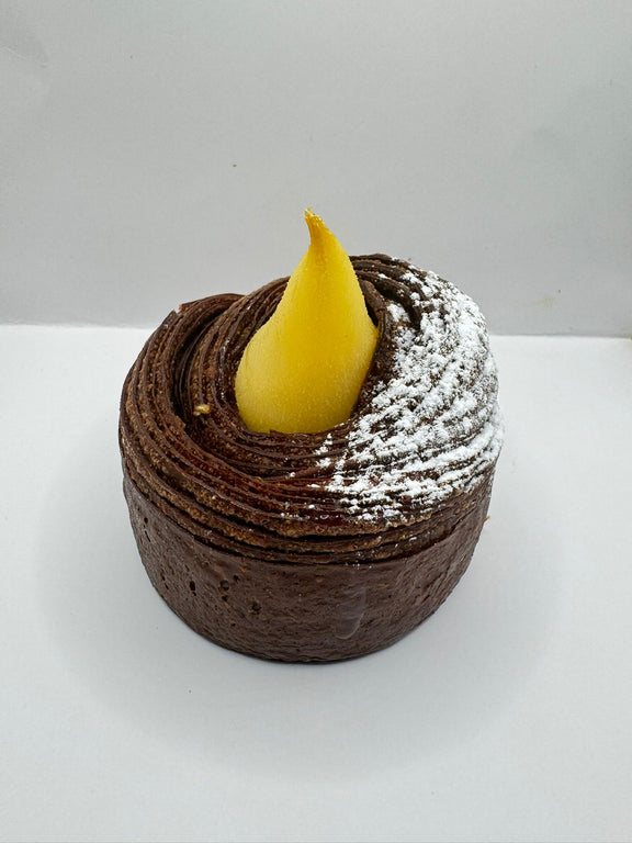 Le poire cacaoté se compose d'une pâte a croissant au chocolat ,crème pâtissière vanille et ganache au chocolat et d'une poire poché.